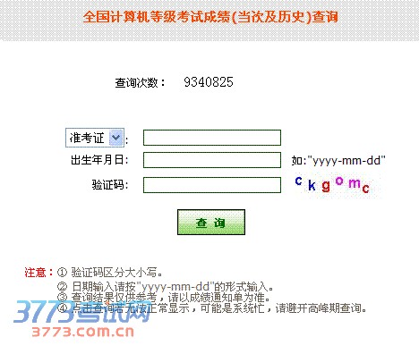注意:① 验证码区分大小写。 ② 日期输入请按"yyyy-mm-dd"的形式输入。 ③ 查询结果仅供参考,请以成绩通知单为准。 ④ 点击查询若无法正常显示,可能是系统忙,请避开高峰期查询。