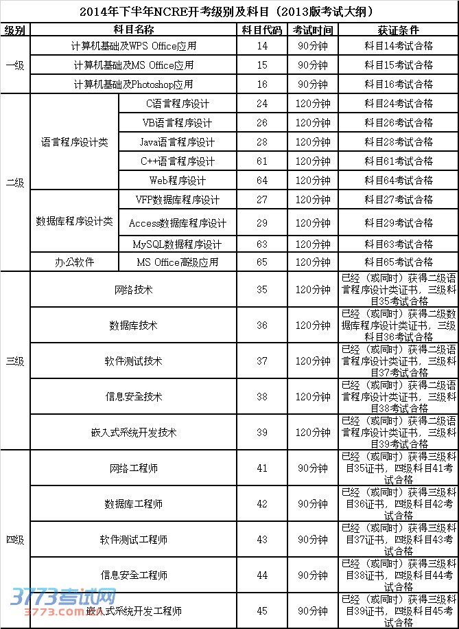 2、考试科目考核课程请到NCRE网站(www.ncre.cn)查询,考试大纲均为2013版,考试教材均为高等教育出版社出版。