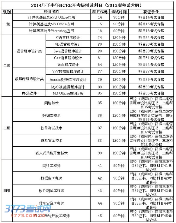 2、考试科目考核课程请到NCRE网站(www.ncre.cn)查询,考试大纲均为2013版,考试教材均为高等教育出版社出版。