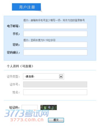 此页面中,“电子邮箱”和“手机”选其中一项填写,作为自己的报名帐号,然后填写密码和密码确认。个人资料不需要填写。验证码要点击三次再输入,点击“提交”注册完毕,请考生一定记住自己的注册帐号和密码,从此次考试开始,报名、打印准考证、查询成绩,一直到证书发放都会用到此帐号。