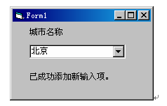 (10)在窗体上画一个名称为Combo1的组合框,然后画两个名称分别为Label1、Label2,标题分别为“城市名称”和空白的标签。程序运行后,在组合框中输入一个新项目并按回车键,如果输入的项目在组合框的列表中不存在,则自动将其添加到组合框的列表中,并在Label2中给出提示“已成功添加新输入项。”,如图所示。如果输入的项目已存在,则在Label2中给出提示“输入项已在组合框中。”。请填空。