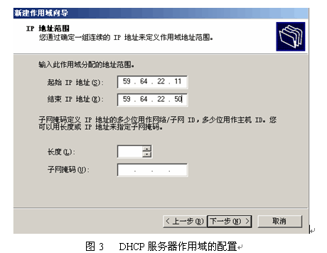 (2) 如图3所示DHCP服务器作用域的配置界面中,长度域输入的数值