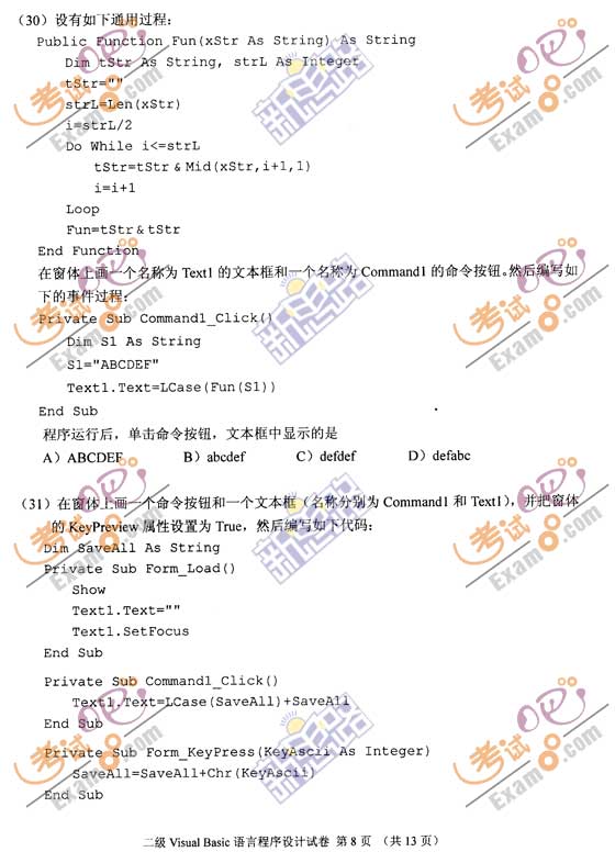 2009年3月计算机等级考试二级VB笔试试题及答案