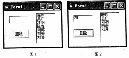 在调试时发现,如输入“陈”,可以正确删除所有姓“陈”的项目,但输入“刘”,则只删除了“刘邦”、“刘备”2项,结果如图2所示。这说明程序不能适应所有情况,需要修改。正确的修改方案是把For k=0 To List1.ListCount-1改为