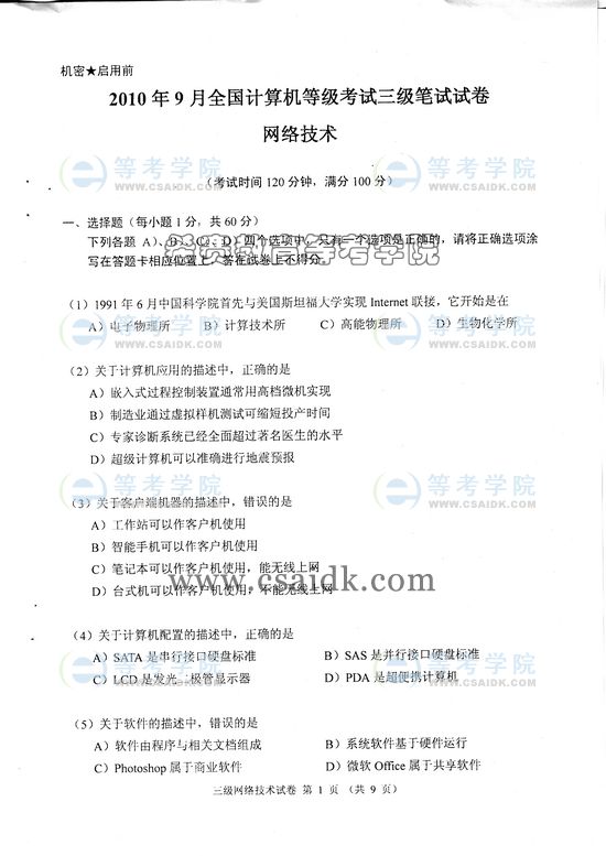 2010年9月计算机等级考试三级笔试试卷_网络技术