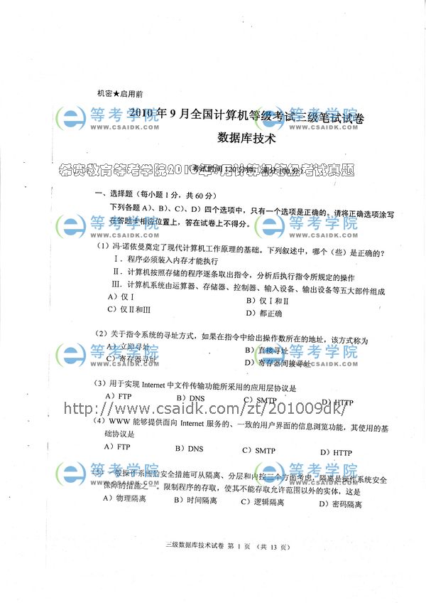 2010年9月计算机等级考试三级笔试试卷_数据库技术