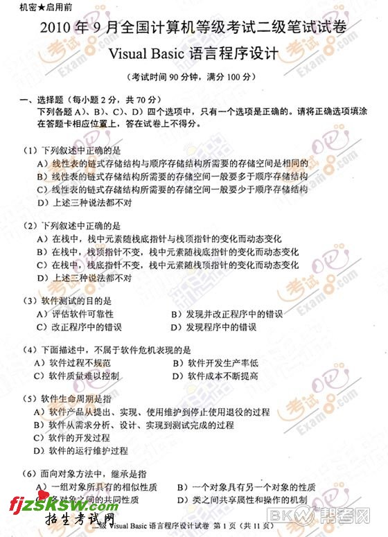2010年9月计算机等级考试三级笔试试卷_数据库技术