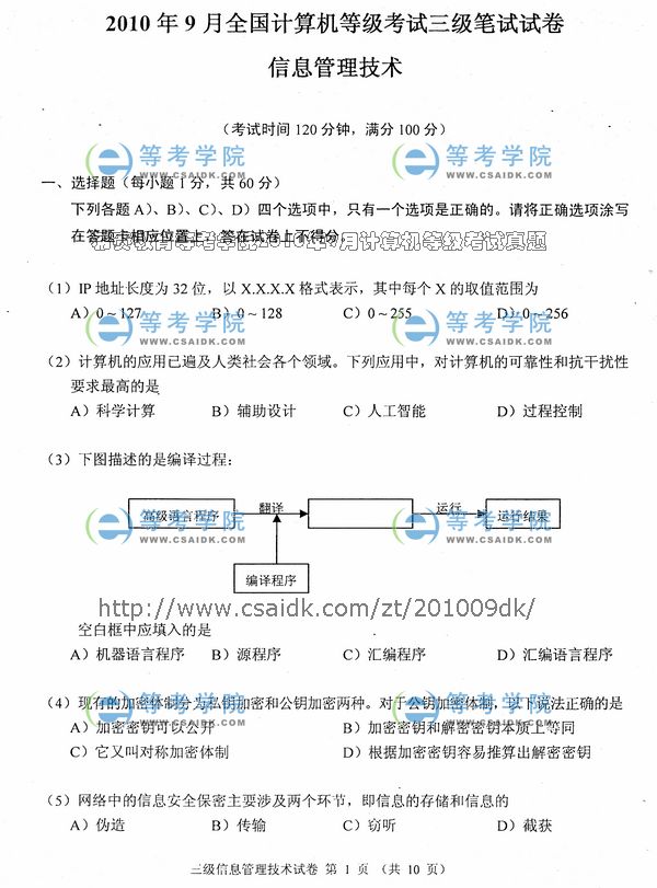 2010年9月计算机等级考试三级笔试试卷_信息管理技术