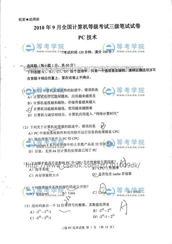 2010年9月计算机等级考试三级笔试试卷_PC技术