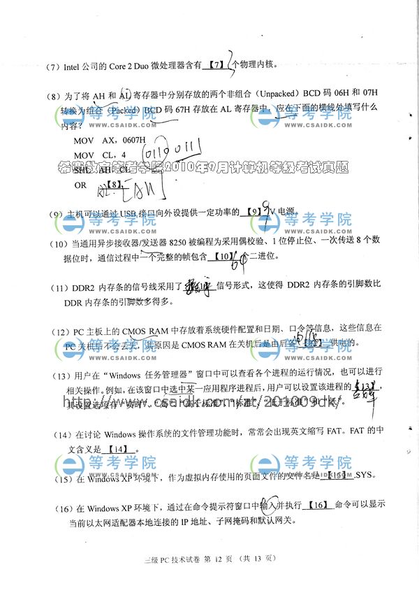 2010年9月计算机等级考试三级笔试试卷_PC技术
