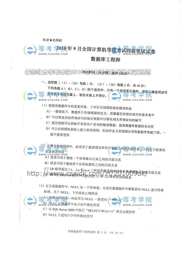 2010年9月计算机等级考试四级笔试试卷_数据库工程师