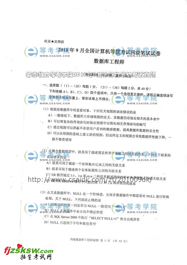 2010年9月计算机等级考试四级笔试试卷_数据库工程师