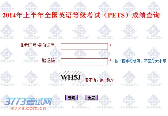 准考证号/身份证号: *验证码: *按下图字符填写,不区分大小写看不清,换一张? 2014年上半年全国英语等级考试(PETS)成绩将于5月6日15:00公布。考生可登录本网站,准确输入本人准考证号或身份证号查询自己的成绩。考生也可在参加考试考点查询成绩。考生如对分数有疑问,须于5月20日前,向考点提出书面申请(应包含考生姓名、准考证号、考试级别、复核要求及联系电话,并由考生本人签名确认),由考点统一上报,逾期不予受理