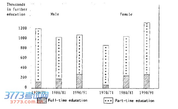 According to the chart, the number of people taking part-time education in Britain in three periods was larger than that of full-time education, while the number of female taking fur-ther education was greater than that of males in further education.