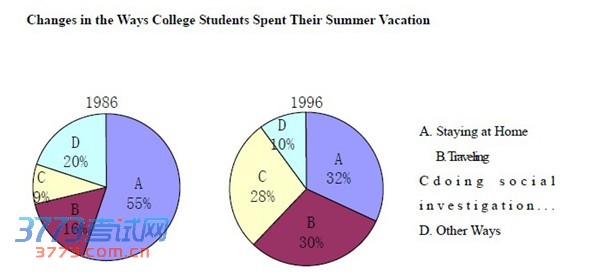 As shown in the charts, the ways college students spend their holidays have changed a great deal from 1986 to 1996. The students who stay at home for the whole vacation have decreased while the students who travel and do social investigation have increased greatly.