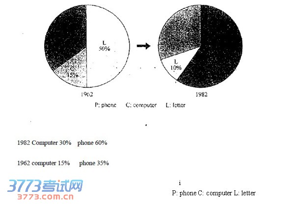 The two pie charts compare different methods of communication used in 1962 and 1982. We can see that for the three mediums surveyed, there are significant changes for each.