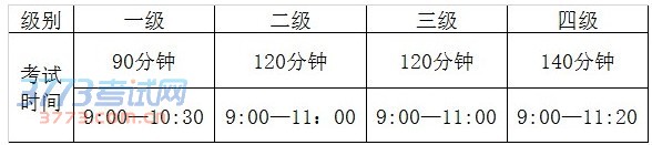 一级B: 3分钟/1名考生;一级:8分钟/2名考生;二级:10分钟/2名考生;三级:10分钟/2名考生;四级:12分钟/2名考生。