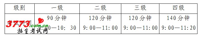 一级B: 3分钟/1名考生;一级:8分钟/2名考生;二级:10分钟/2名考生;三级:10分钟/2名考生;四级:12分钟/2名考生。