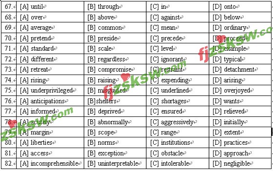 The loudest outcry about poverty seemed to come in the wealthiest country by far in the world. According to most calculations, 67 most of that period the United States had a standard of living well 68 Europe's and many times above the world 69 . Yet protests about grinding poverty, hunger, and dreadful need 70 more from the United States than from countries with one-fortieth of their living 71 . An annual per capita income of about 500 dollars is 72 of much of Africa and Asia and not a little of South America. It would seem strange to these people that American radicals demand a 73 from an American commitment to the far corners of the globe so that the money thus saved can be spent 74 the standard of living of 75 Americans. What this last point suggests is not so much that human 76 are never to be satisfied though this is doubtlessly true, and the American suburbanite(郊区居民) 77 of his second car and his color TV suffers just as 78 as an African farmer in need of a second cow and a screen door. Rather, it suggests the 79 of contemporary breach of social 80 —the emancipation of the individual self. People have learned to consider any 81 to personal fulfillment as a(n) 82 insult. They have greatly expanded the circle of self-awareness. They no longer accept sharp limitations on individual desires in the 83 of the group. The amount of potential human discontent has always been 84 —misery, failure, misfitting, bitterness, hatred, envy 85 telling. It has usually failed of 86 , and in the past it was accepted passively as being beyond help.
