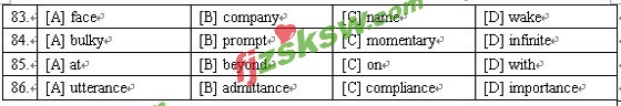 86.A 逻辑衔接题。空格所在句中的it指代的应该是上文的discontent,而上文提到了无法言语的不满,因此此处应为“不满通常无法说出”,故选A。admittance意为“准人”,compliance意为“顺从”importance意为“重要性”,均应排除。