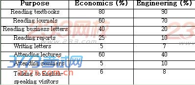 下图是对不同专业学生学习英语的不同目的所做的调查结果,请描 述并分析此图。
