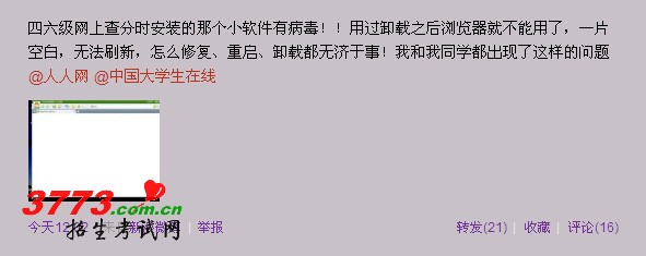 记者在新浪上看到,有此相同遭遇的考生还真不少。“那个神马加密锁搞得我的电脑都上不成网了,悲剧。”“四六级网上查分时安装的那个小软件有病毒!用过卸载之后浏览器就不能用了,一片空白,无法刷新,怎么修复、重启、卸载都无济于事!我和我同学都出现了这样的问题。”“四六级今天查分,比看到分数更心酸的是——竟然上不了网了!”“我以为只有我一个人出问题了!卸载了还不行。”“四六级那个查询加密锁把家里的台式机搞黑屏了。”“那个99宿舍网有毒,坑死我了。”