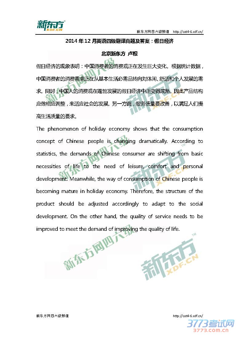 2014年12月大学英语四级翻译真题及答案:假日经济