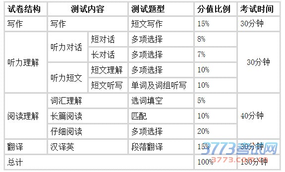 四级和六级的试卷构成相同,由写作、听力理解、阅读理解和翻译四个部分组成,分值比例为:写作15%,听力35%,阅读35%,翻译15%。考试时间为130分钟。四级和六级的试卷结构、测试内容、测试题型、分值比例和考试时间如下表所示: