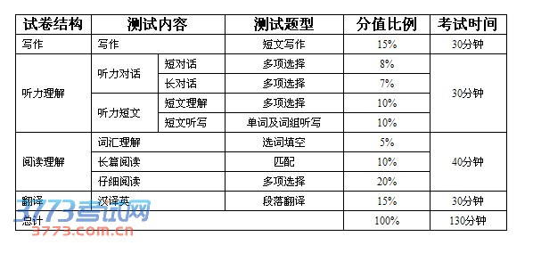 自2013年12月考次起,全国大学英语四、六级考试委员会将对四、六级考试的试卷结构和测试题型作局部调整。调整后,四级和六级的试卷结构和测试题型相同。