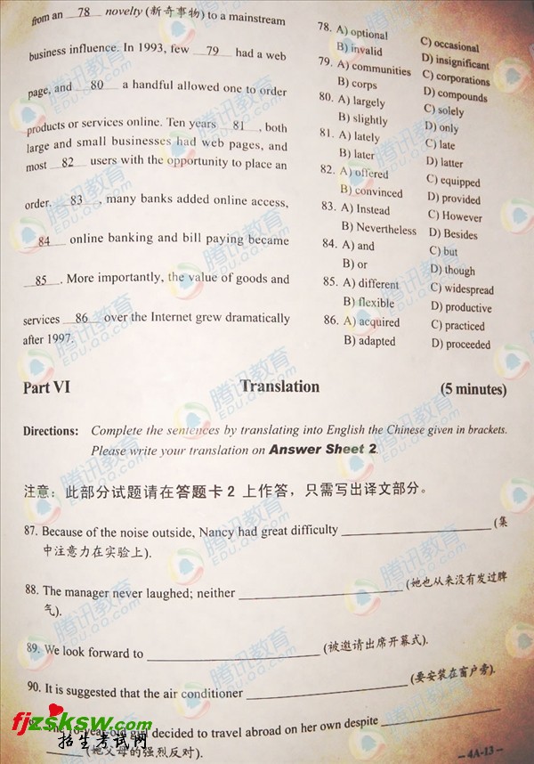 | [真题答案]2010年6月大学英语四级答案:翻译试题 |