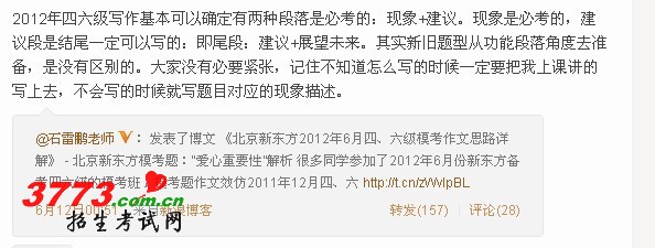 诚如之前给学生强调的一样,2012年6月四级写作回归传统题型:英语题目+汉语提纲。这一点,本人在最近的博客中专门提到过。虽然没有准确砸中话题,但是段落都是我上课讲过和要求大家背诵的段落。