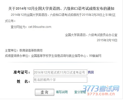 2014年12月全国大学英语四、六级和口语考试成绩将于2015年2月28日上午9时正式公布。查分网址为:cet.99sushe.com全国大学英语四、六级考试委员会办公室2015年2月10日主管单位:教育部高等教育司成绩查询承办单位:全国高等学校学生信息咨询与就业指导中心、99宿舍网