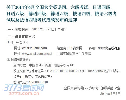 英语四六级成绩查询将在2014年8月20日上午9时公布!