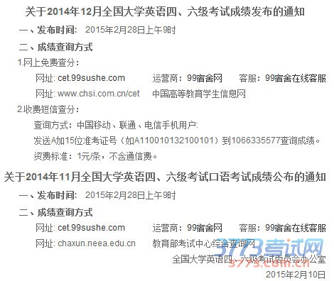 与此同时,2014年11月全国大学英语四六级考试口语考试成绩也将在同时时间公布。查分方式仅限于99宿舍网和教育部考试中心综合查询网。以下是通知完整截图。