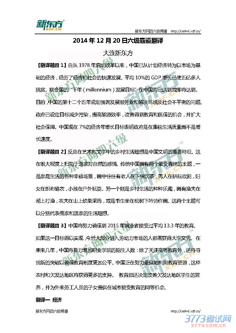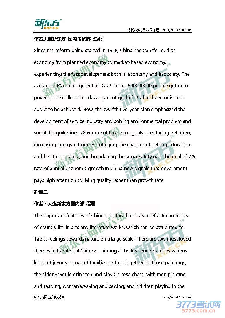 【翻译题目1】自从1978年启动改革以来,中国已从计划经济转为以市场为基础的经济,经历了经济和社会的快速发展。平均10%的GDP增长已使五亿多人脱贫。联合国的“千年(millennium)发展目标”在中国均已达到或即将达到。目前,中国的第十二个五年规划强调发展服务业和解决环境及社会不平衡的问题。政府已设定目标减少污染,提高能源效率,改善得到教育和医保的机会,并扩大社会保障。中国现在7%的经济年增长目标表明政府是在重视生活质量而不是增长速度。