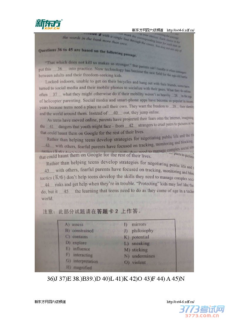 2015年12月英语六级阅读选词填空答案