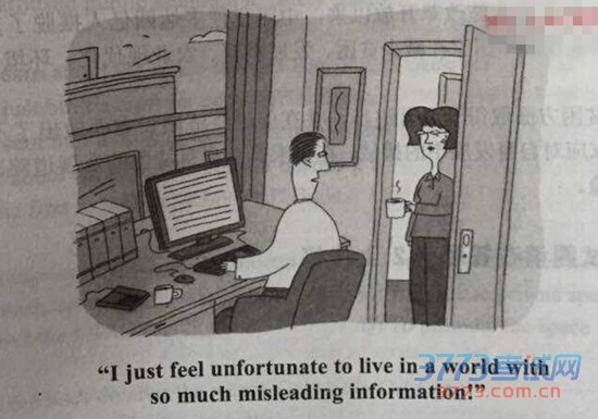 The cartoon, vivid and explicit, unfolds a sense to us, in which a woman, who stands by the door, makes a cup of coffee for her husband. However, the most striking feature of the drawing is that the husband, working in front of a computer, says that he feels unfortunate to live in a world with so much misleading information. Simple as the illustration seems, it discloses a serious problem that it is rather hard to obtain useful and helpful information in the highly modernized society.