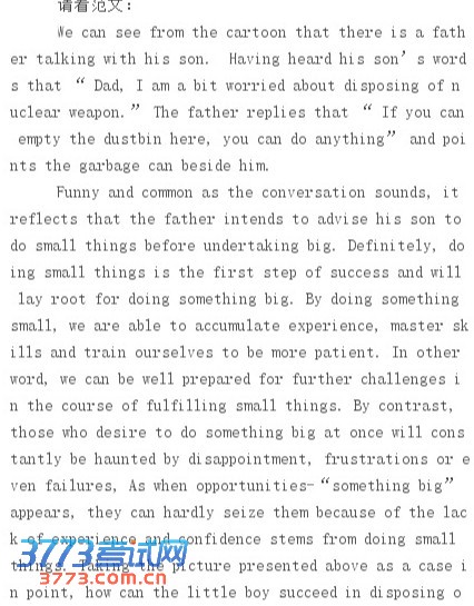 2013年6月15日全国大学英语四、六级考试开考,本次考试继续沿用“多题多卷”形式。3773考试网外语频道为广大考生搜集了英语四级作文题,以供广大考生参考: