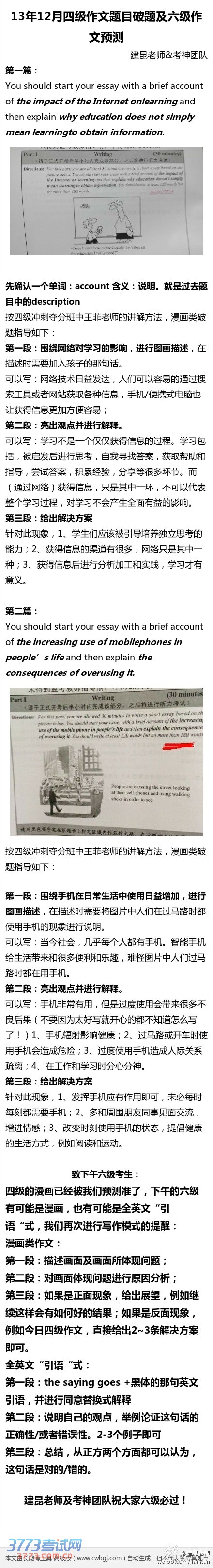 2013年12月英语四级作文题目破题及六级作文预测 四级作文A版与B版的清晰大图及破题指南,另附下午六级考试的作文预测。四级漫画类作文在夺分班里被多次提及