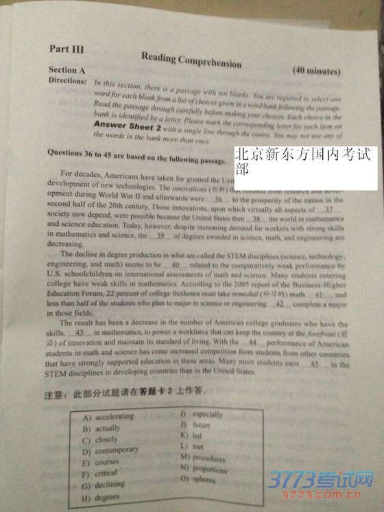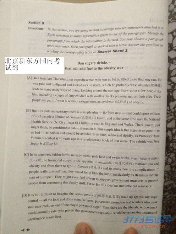 2014年12月英语四级真题及答案(新东方图片完整版) 2014年12月英语四级考试时间为12月20日上午:9:00—11:25。2014年12月英语六级考试时间为12月20日下午:15:00—17:25。3773考试网第一时间发布四级真题及答案、六级真题及答案