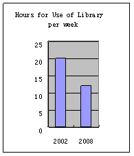 As is displayed in the two charts above, there is a sharp change in (变化)the students’ use of library and Internet(事件)from 2002 to 2008 (时间)in one university of Nanjing(地点)(第一句话通常进行总述). Specifically,(具体描述)The average hours for use of library for study per week(注1) in 2002 was about twenty hours while it declines to about 12 hours per week in 2008. By contrast, there is a fast increase in the average hours for students’ use of Internet for study(注2)at the same period; the average hours increase from about seven hours to about eighteen hours.
