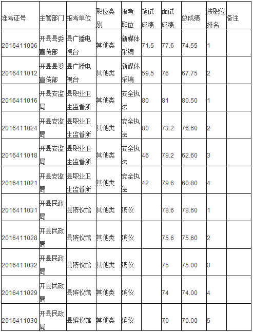 说明:根据《开县2016年公开考核招聘卫生和部分其他事业单位工作人员简章》规定,“对采取‘先笔试、再面试’方式进行考核测试的职位考生,其考核测试总成绩=笔试成绩×50%+面试成绩×50%;对采取‘直接面试’方式进行考核测试的职位考生,其考核测试总成绩=面试成绩”。现将报考新媒体采编、安全执法、殡仪职位进入面试考生的各项成绩公布如下: