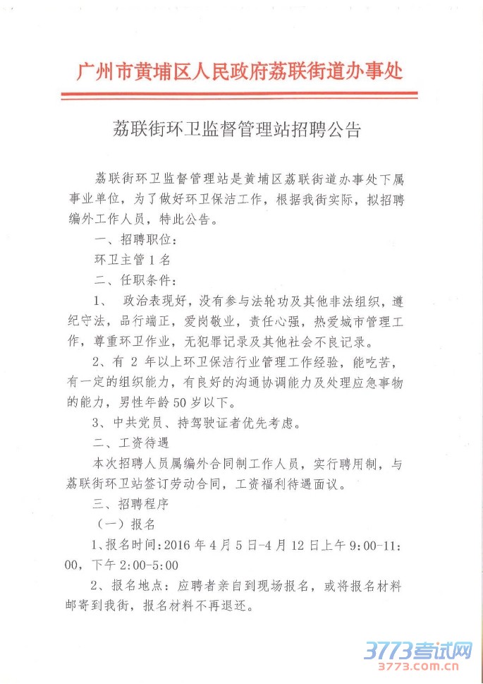 2016广东黄浦区荔联街环卫监督管理站招聘公告
