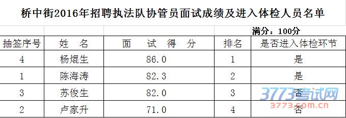 2016广东荔湾区桥中街执法队协管员招聘面试成绩及体检公告