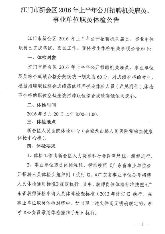 广东江门市新会区2016上半年招聘机关雇员、事业单位职员体检公告