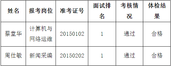 广西壮族自治区电化教育馆2015年度公开招聘专业技术人员资格审查、笔试、面试、考核、体检等工作已经结束,根据《广西壮族自治区事业单位公开招聘人员实施办法》(桂人社发〔2011〕155号)、《关于进一步规范区直事业单位公开招聘工作的通知》(桂人社办发[2013]135号)等有关规定和人社厅、教育厅批复的公开招聘方案,现将拟聘人员名单公示如下: