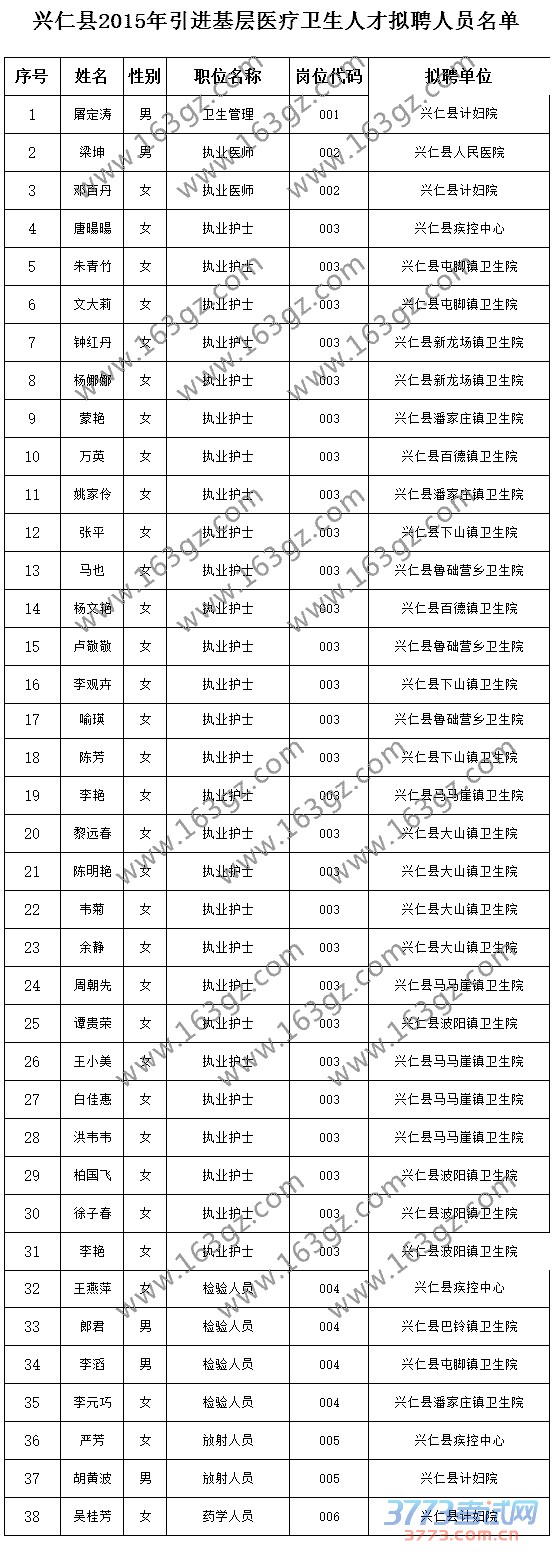 根据《州人社局 州卫生计生委关于2015年黔西南州引进基层医疗卫生人才工作的通知》(州人社通〔2015〕122号)、《2015年兴仁县引进基层医疗卫生人才简章》的规定,经兴仁县人社局、卫计局组织面试、体检、考察合格,州卫计委、州人社局审核,确定屠定涛等38名同志为拟聘用人员,现予以公示,公示期七天(2016年3月31日-4月6日),公示期间如有疑问,请用书面方式署实名向州卫计委人教科反映,拟聘用人员名单详见附件。