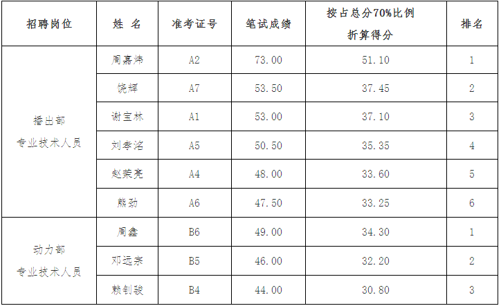 按照《江西省七0七电视台面向社会公开招聘专业技术人员方案》, 根据笔试成绩,从高分到低分按1:3的比例确定面试人选(与入闱最后一名成绩并列者一并列入),现将入闱面试人员名单公告如下: