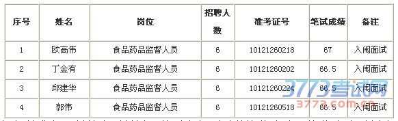 根据《赣州市食品药品监督管理局下属事业单位2016年公开招聘工作人员公告》规定,我局于2016年5月10日—11日(上午:9:00-17:30)组织进行了面试前资格审查,101001002岗位邹韬1人资格审查不合格,101001002岗位廖珉1人自动放弃。按照《赣州市食品药品监督管理局下属事业单位2016年公开招聘工作人员公告》“面试前资格审查不合格、考生自动放弃(以规定时间未参加资格审查领取面试准考证为依据)致某职位招聘人数与面试人数达不到1:3的,从报考该职位的考生中,按笔试成绩从高分到低分递补一次,使招聘人数与面试人数达到1:3”的规定,101001002岗位需递补2人(成绩并列者一并列入),现将递补入闱面试人员名单公告如下: