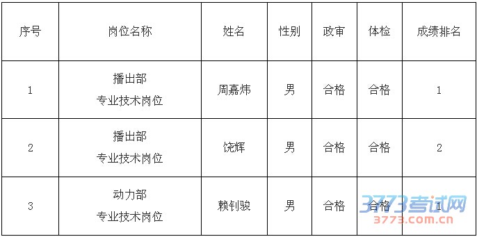 按照《江西省七0七电视台面向社会公开招聘专业技术人员公告》,经过现场报名、资格审查、笔试、面试、政审、体检等程序,经研究,确定以下3名同志为江西省七0七电视台面向社会公开招聘专业技术人员拟录用人员,现予公示。